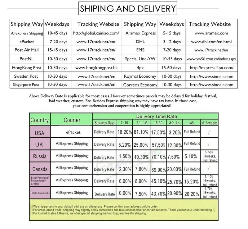 Mode de Paiement 1. Il existe de nombreuses méthodes de paiement disponibles sur Adafar telles que Alipay, les cartes de crédit, les virements bancaires en temps réel, les paiements hors ligne (virements bancaires et Western Union). Vous pouvez choisir la méthode qui vous convient le mieux. Pour protéger vos intérêts, votre paiement sera temporairement retenu par Alibaba, et ne nous sera pas communiqué tant que vous n'aurez pas reçu votre commande et n'en serez pas satisfaite. Expédition 1. Lorsque nous avons reçu les informations de votre commande et le paiement, nous avons généralement 2-5 jours pour compléter la livraison, nous fournissons des informations de suivi logistique. Cependant, en raison de certains facteurs et problèmes géographiques qui peuvent entraîner un retard dans la livraison, j'espère pouvoir comprendre, le temps de transit est généralement de 15-40 jours, veuillez être patient. 2. Si vous avez besoin d'un mode logistique de transport plus rapide, vous pouvez choisir d'autres moyens, veuillez nous contacter. 3. Nous ne sommes pas responsables des droits de douane ou des taxes d'importation. 4. La commande vous sera envoyée par la compagnie maritime dans le délai de livraison en se référant à la liste des services d'expédition ci-dessous. Si vous n'avez pas reçu le colis dans le délai de livraison, veuillez nous contacter, nous nous en occuperons et nous vous répondrons dans les 24 heures. Politique de remboursement 1. Nous garantissons entièrement nos articles. Tous les articles sont en état neuf sauf indication contraire dans la description. 2. Tous les retours-défectueux ou autrement-doivent être pré-autorisés. Veuillez nous contacter pour obtenir une autorisation et une adresse de retour avant de renvoyer l'article. 3. Dans tous les cas, les acheteurs paieront les frais d'expédition à leurs propres frais pour renvoyer les produits pour échange ou remboursement. Nous serons responsables de l'envoi des remplacements. Nous contacter 1. Si vous avez des questions, n'hésitez pas à nous contacter, nous vous répondrons dès que possible 2. Nous répondrons à votre question par email, veuillez vérifier votre email pour les réponses. Commentaires 1. Veuillez m'envoyer un e-mail avant de laisser des commentaires si vous n'êtes pas satisfait de votre article, afin que nous puissions résoudre le problème. 2. Acheteurs internationaux, veuillez noter: les droits d'importation, les taxes et les frais ne sont pas inclus dans le prix de l'article ou les frais d'expédition. |