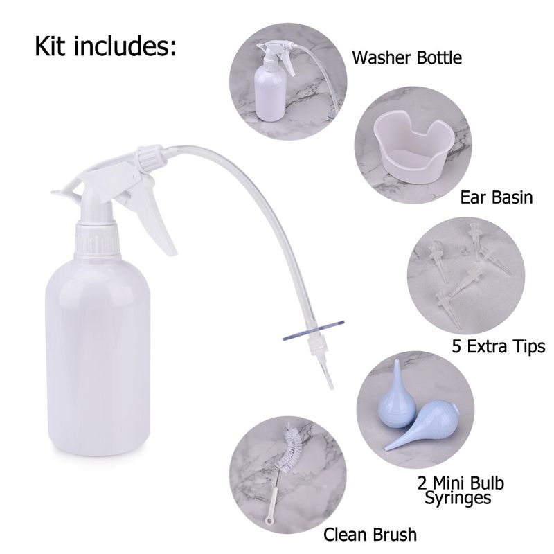 1 x bouteille de nettoyage d'oreille avec pulvérisateur 1 x Mini seringue d'ampoule 1 x bassin d'oreille 2 x Tube Flexible 5 x embouts supplémentaires 1 x brosse propre 1 x manuel d'utilisation