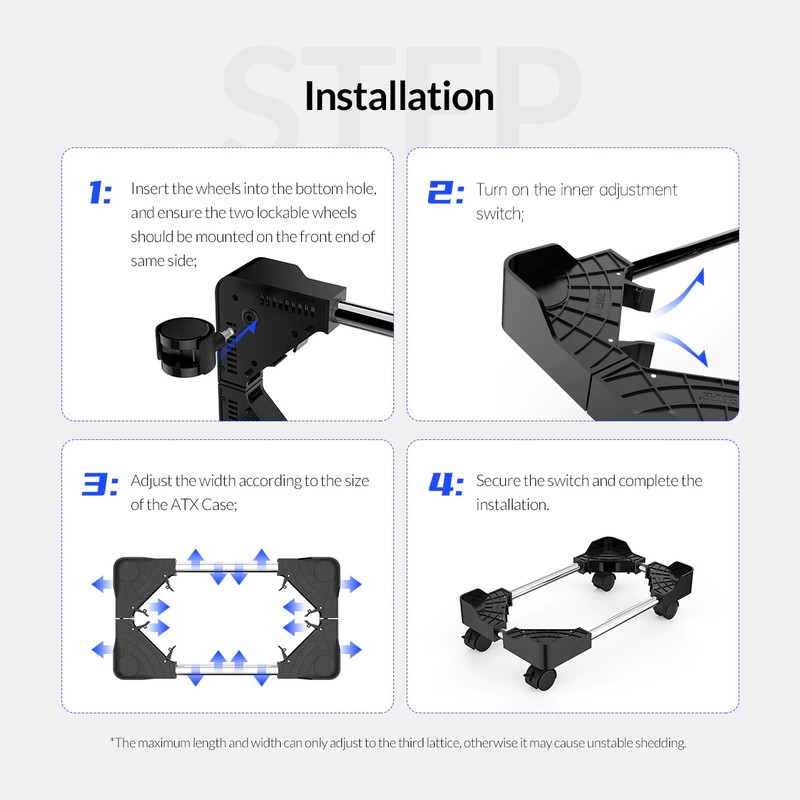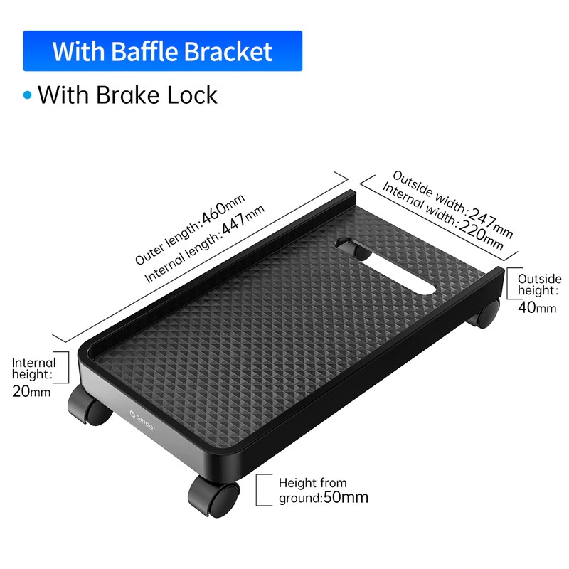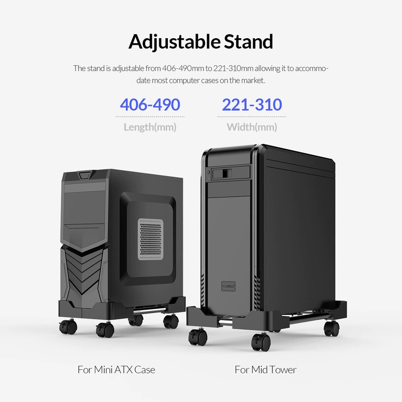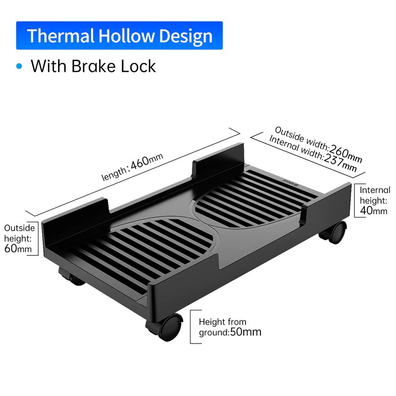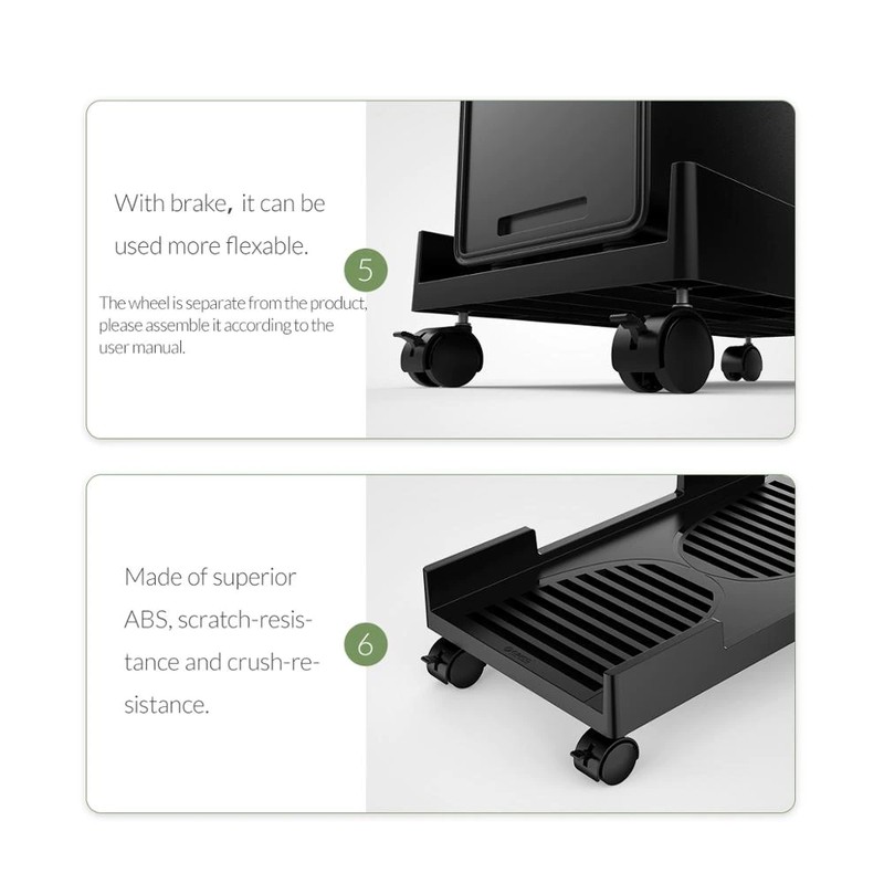 Ce support PC vous permet de soulever et de ventiler correctement votre tour d'ordinateur, pour garder la poussière et l'humidité du sol et protéger l'ordinateur et le support lui-même. Pendant ce temps, ce support dispose de quatre roulettes omnidirectionnelles pour un mouvement fluide et un placement pratique.