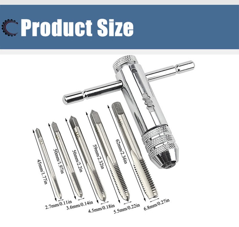 Finition chromée pour la plus grande durabilité; Taille des tarauds à vis: M3 * 0.5, M4 * 0.7, M5 * 0.8, M6 * 1.0, M8 * 1.25; Utilisation: pour les robinets M3-M8; Longueur de la clé: 85mm/3,35 pouces