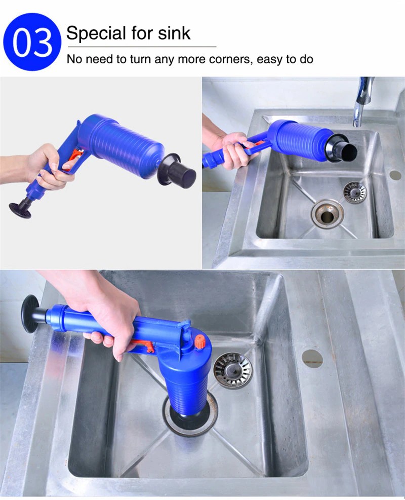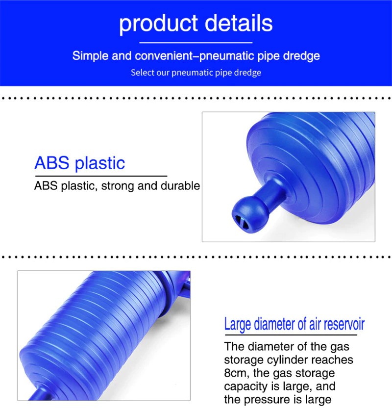 WERSATILE ET EFFICACE.Il peut faire face à divers blocages causés par toutes sortes de déchets tels que les cheveux, les tissus, le thé, les feuilles, la graisse, les impuretés d'huile, etc. Avec une puissance d'air à haute pression, il nettoie les drains rapidement et facilement. Parfait pour les travaux sur les éviers, les baignoires et les toilettes.