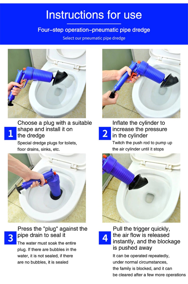 COMMENT UTILISER:Secouez la poignée jusqu'à ce que le coup ne part pas, généralement plus de 10. Placez une ventouse appropriée sur la bouteille de gaz, alignez la ventouse avec la bouche des toilettes ou la bouche du tuyau, creuser un trou au milieu du sac noir (ou du carton), Puis réglez la tête du pistolet et appuyez sur la gâchette.