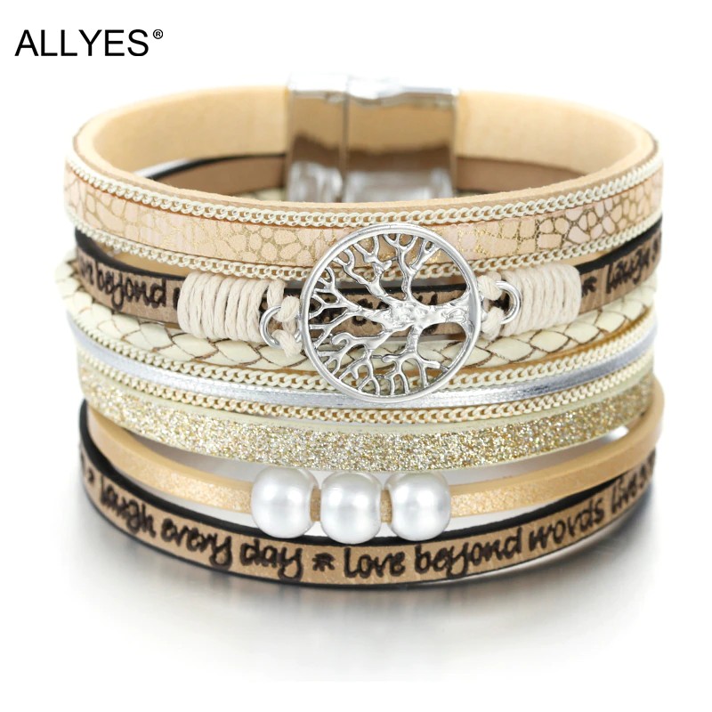 - Article:ALLYES – Bracelets en cuir perlé avec breloque arbre de vie pour femmes, à la mode, bohème multicouche, large, bijoux féminins, 2020