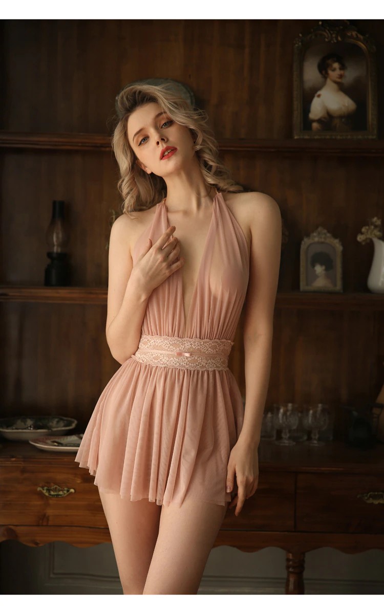 Belle Robe De Nuit En Dentelle Gaze, Dos Nu, Tentation Blanche Sexy Maille Col Suspendu Fée Tulle Perspective, Chemise De Nuit