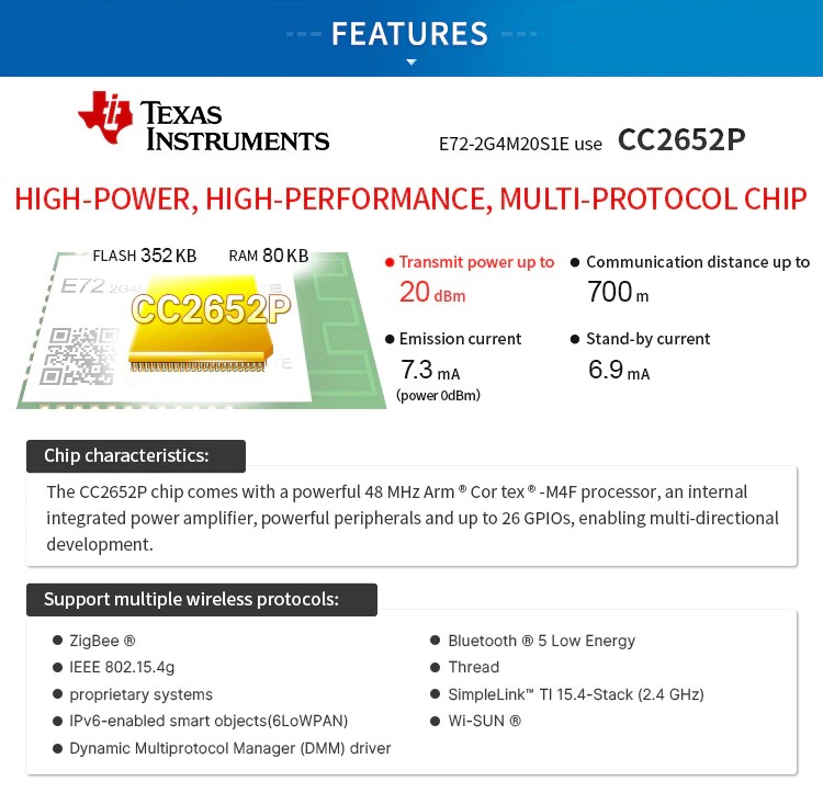 Module Sans Fil Cc2652P Zigbee 3.0 2.4Ghz, 20Dbm Longue Portée 700M Arm Mcu Smd Ble 5.0 Soc Émetteur Récepteur E72-2G4M20S1E