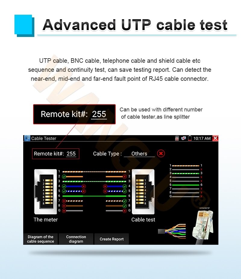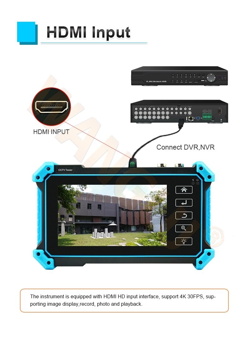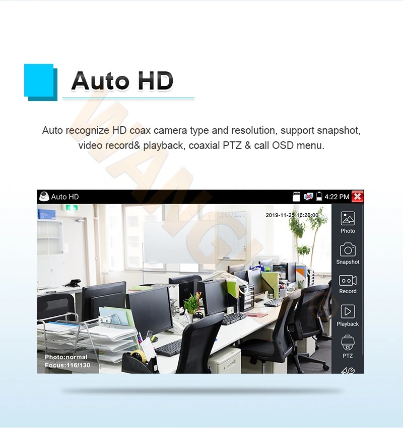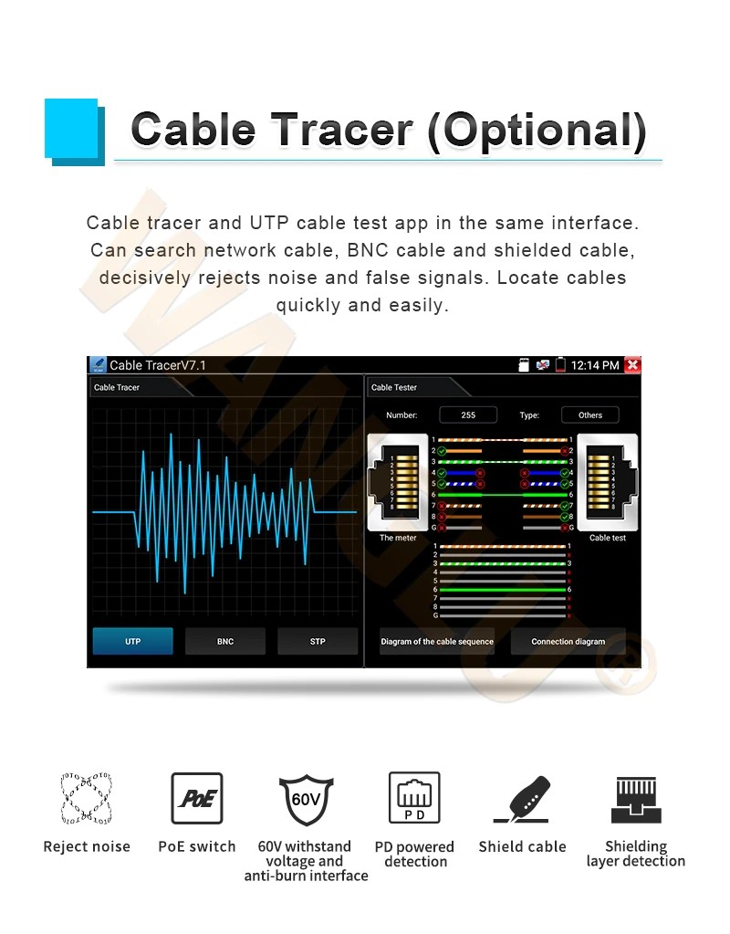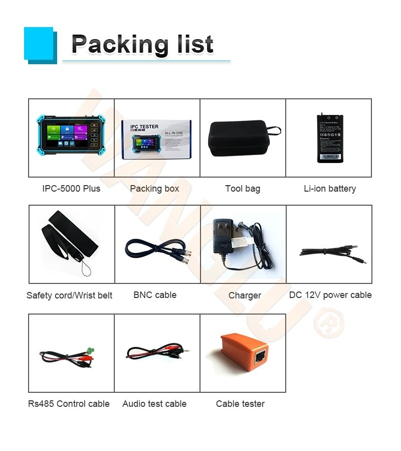 Modèle: série IPC-5000 Plus IPC-5000 Plus supporte 8MPAHD TVI CVI avec batterie (traceur de câble numérique en option) IPC-5100 Plus supporte 8MPAHD TVI CVI avec batterie (traceur de câble numérique en option) + HDMI in, VGA in IPC-5200 Plus supporte 8MPAHD TVI CVI avec batterie (traceur de câble numérique en option) + SDI , HDMI in , VGA in ● Écran tactile IPS de 5 pouces, résolution de 1920x1080 ● Test de caméra CVI/ TVI/ AHD 8MP ● Test de caméra 8MP EX-SDI, HD-SDI, 3G-SDI ● Navigateur chromé, test et réglage de la caméra d'axe ● H.265/H.264, affichage vidéo 4K via grand public ● Entrée VGA, supporte 1920x1200 60FPS ● Entrée HDMI, supporte 4K 30FPS ● ONVIF rapide, visualisation automatique de la vidéo et création d'un rapport de test ● Puissance de sortie DC12V 3A, 48V PoE ● HD automatique, reconnaissance automatique du type et de la résolution de la caméra coaxiale HD ● Test de câble TDR RJ45, ouverture du câble, test de short et de longueur, Max180m. ● Test de câble UTP, détecter le point de défaut proche, moyen et lointain de la prise de câble RJ45 Essai de caméra: ● Écran tactile IPS de 5 pouces, résolution de 1920*1080 ● H.265 & H .264 IP, affichage vidéo 4K via grand public ● Test de caméra analogique, contrôleur PTZ ● 8MP TVI, 3840x2160P 12.5/15 FPS, 4xzoom, enregistrement vidéo et lecture, coaxial PTZ contrôle et menu de l'appel OSD ● 8MP AHD test 3840x2160P 15 FPS, 4xzoom, enregistrement vidéo et lecture, coaxial PTZ et menu de l'appel OSD ● 8MP L'ICB, 3840x2160P 12.5/15FPS, 4xzoom, enregistrement vidéo et lecture, coaxial PTZ et menu de l'appel OSD ● 8MP EX-SDI test 3840x2160P 25/30FPS,4xzoom, enregistrement vidéo et lecture, coaxial PTZ et menu de l'appel OSD ● Test HD-SDI, 1920x1080PFPS, 4xzoom, enregistrement vidéo et lecture, coaxial PTZ et menu de l'appel OSD ● 3G-SDI test 1920x1080P 50/60 FPS, 4xzoom, enregistrement vidéo et lecture, coaxial PTZ et menu de l'appel OSD ● Application HD automatique, reconnaissance automatique du type et de la résolution de la caméra coaxiale HD, prise en charge de l'instantané, enregistrement et lecture vidéo, PTZ coaxial et menu OSD d'appel ● Entrée VGA, jusqu'à 1920x1200 60FPS, prise en charge de l'instantané, enregistrement vidéo et lecture * ● Entrée HDMI, jusqu'à 4K 30FPS, prise en charge de l'instantané, enregistrement et lecture vidéo; Sortie HDMI * ● ONVIF rapide, connexion automatique et affichage de l'image, créer un rapport de test ● Axe, test de caméra Hikvision, entrez l'application ONVIF, entrez le nom d'utilisateur et le mot de passe pour tester ● IPC test pro, scan automatique de tous les segments de réseau IP, ouverture automatique de l'alimentation PoE et affichage de l'alimentation. Entrez le nom d'utilisateur et le mot de passe, peut scanner l'image de la caméra, peut activer les caméras par lots. Passez à l'interface ONVIF et aux outils de test. ● Test de caméra CVBS et contrôle PTZ ● Test de caméra, entrez l'application ONVIF, entrez le nom d'utilisateur et le mot de passe pour tester ● Affichage de l'image IP et analogique en même temps ● TEST ipc (test Non ONVIF), outil de test HIK (caméra Hikvision), outil de test DH (caméra Dahua) ● Puissance de sortie PoE 48V ● Sortie d'alimentation cc 12 v/3a, la caméra peut être alimentée à partir de 12 tensions cc ● Vidéo rapide, une seule touche pour détecter toutes les caméras réseau et affichage automatique ● Wi-Fi intégré, affiche l'image de la caméra sans fil, crée un hotspot WIFI, taux de wifi de 150M, supporte uniquement 2.4G ● Test de boucle CVBS, le testeur envoie et reçoit le signal de générateur de barre de couleur, pour vérifier le câble BNC ● Générateur de barre de couleur amélioré, générateur vidéo de barre de couleur multi-système PAL/NTSC Câble d'essai: ● Testeur de câble d'amélioration, câble UTP, câble téléphonique, etc. commande et test de connectivité, peut enregistrer le rapport de test, si numéro spécial, besoin de personnaliser. Peut détecter le point de défaut proche, moyen et lointain de la prise de câble RJ45 ● Test de câble TDR RJ45, état de la paire de câbles de test, longueur, atténuation, réflectivité, impédance, inclinaison, etc., peut créer un rapport de test ● Traceur de câble numérique, recherchez le câble BNC, le câble réseau et le câble téléphonique à partir des câbles de désordre. La recherche de câble et le câble UTP peuvent être testés en même temps * (fonction optionnelle, si vous avez besoin de l'ajouter, veuillez nous contacter) Autres Fonctions: ● Outil réseau: Ping, scan IP, Port Flash, serveur DHCP, itinéraire de Trace ● Jeu de testeur: testeur, téléphone mobile version android et affichage PC en même temps ● Surveillance du trafic, affichage du port réseau ou de la connexion WIFI vitesse de téléchargement et de téléchargement en temps réel et autres paramètres réseau ● Logiciel d'auto-mise à jour des clients, vous pouvez installer des applications avec la version android ● Lecteur multimédia, lecture de fichiers vidéo 4K et de fichiers multimédia MKV/MP4. Ne prend pas en charge USB, lecture de disque U. ● Affiche sa véritable résolution des images de la caméra IP ● PoE & informations d'alimentation, DC12V & PoE puissance et tension sortie/mesure d'entrée ● Entrée Audio, prend en charge l'enregistrement et l'enregistrement de la lampe audio/LED, des calculatrice, des lecteurs de musique et d'autres outils d'application ● Logiciel d'auto-mise à jour, vous pouvez installer des applications avec la version android ●Batterie Lithium-ion 7.4 V/2600mAh, après 3-4 heures de charge, le temps de travail dure 5 heures (pour IPC-5000 plus) Batterie Lithium-Ion 7.4 V /3350mAh, après 3-4 heures de charge, le temps de travail dure 6 heures (pour IPC-5100 plus et IPC-5200 Plus) APP, notamment: Camé