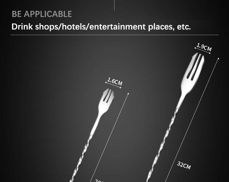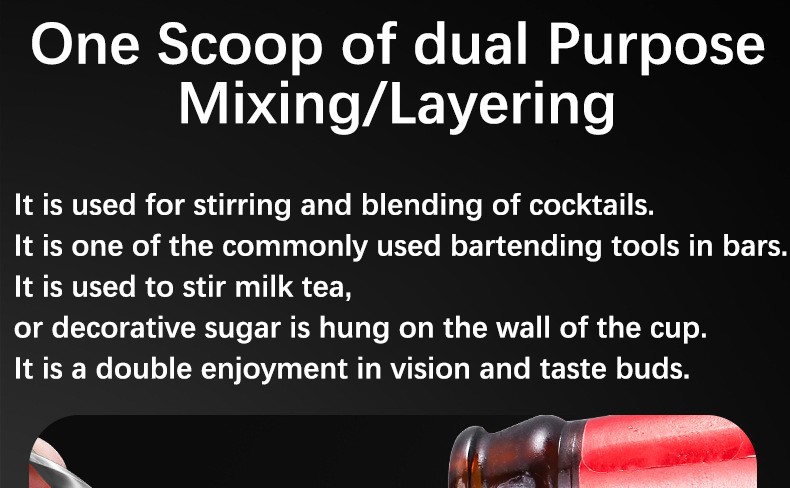 Il est utilisé pour remuer et mélanger des cocktails. C'est l'un des outils de barman couramment utilisés dans les bars. Il est utilisé pour remuer le thé au lait, ou le sucre décoratif est accroché au mur de la tasse, ce qui donne un double plaisir en vision et en grains de goût.