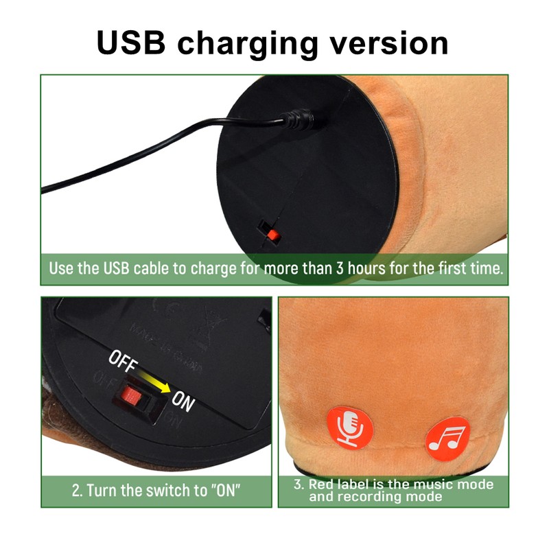 -Chargez les piles et appuyez sur le bouton, la peluche se balancera et chantera des chansons! Comme la poupée contient des composants électroniques, il est recommandé d'essuyer la poussière avec un chiffon humide.