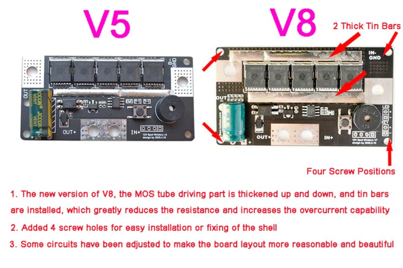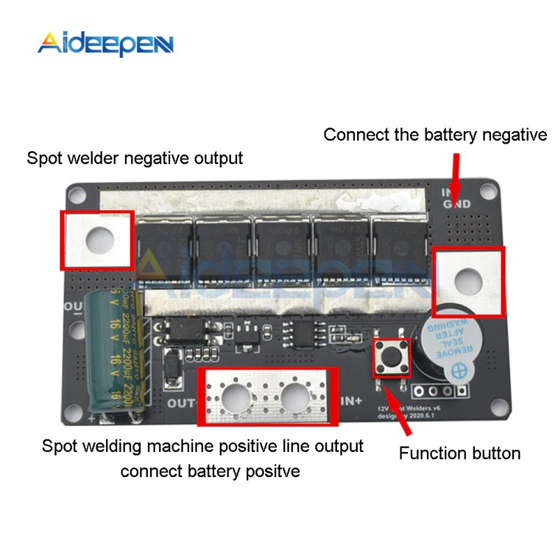 Les utilisateurs doivent apporter leur propre batterie 12V pour l'alimentation, le courant de soudage est d'environ 90A ~ 130A, et il est facile de souder la feuille nickelée commune de 0.1mm ~ 0.12mm. Veuillez vous assurer que votre batterie peut avoir un courant supérieur à 90A, sinon vous ne pourrez pas souder!