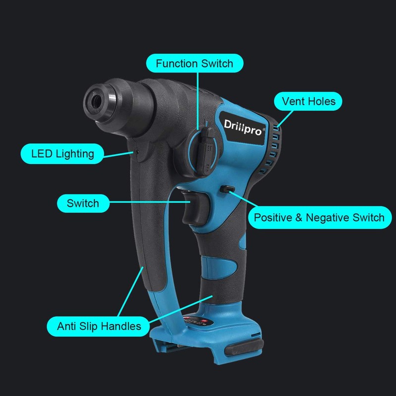 Drillpro – Perceuse Électrique Sans Fil, Perceuse À Marteau Rotatif, Marteau De Démolition, Outil Électrique Rechargeable Pour Batterie Makita 18V