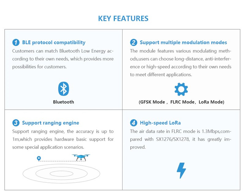 Air débit de données | LoRa(bps):0.595k ~ 253.9k FLRC(bps):260k ~ 1.3M GFSK(bps):125k ~ 2M | Défini par l'utilisateur via la programmation |