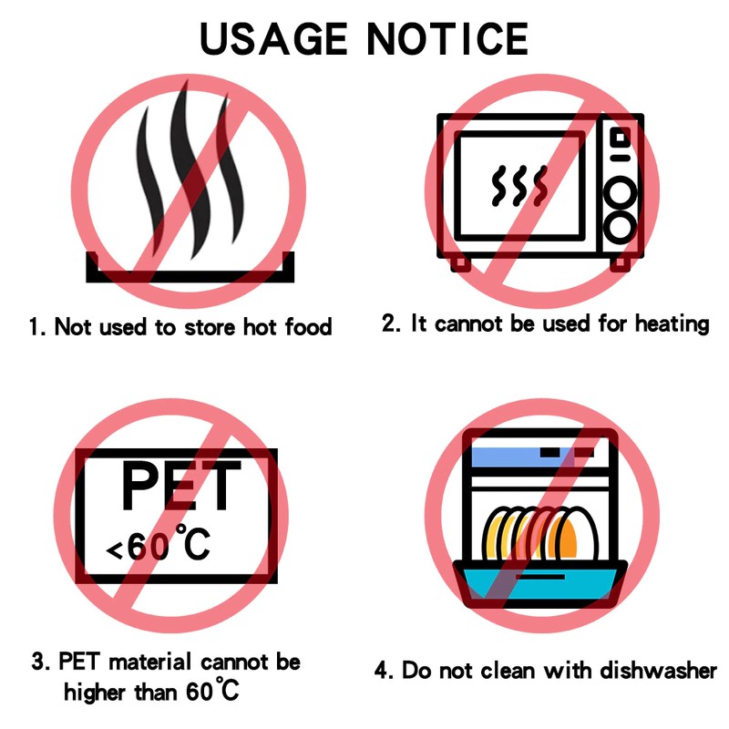 Ces récipients de stockage ne peuvent pas être utilisés pour le chauffage, les fours à micro-ondes, les fours et les lave-vaisselle, et ne peuvent pas être utilisés pour les aliments qui émettent de la chaleur, car les matériaux PET ne peuvent pas dépasser 60 degrés Celsius.