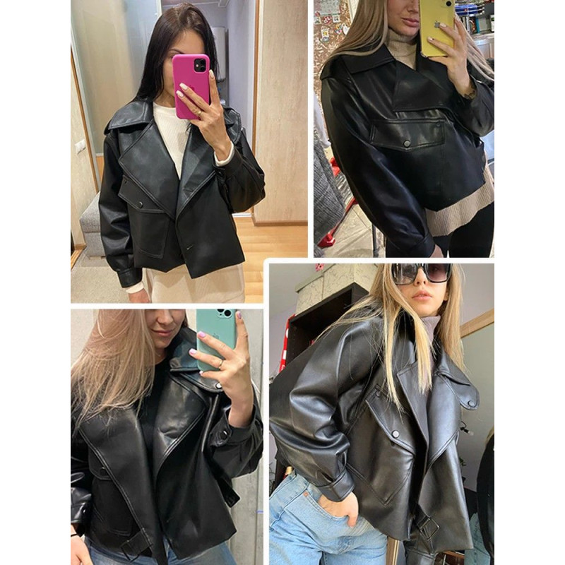 Ftlzz Blouson De Motard En Faux Cuir Femme, Col Rabattu, Rouge Et Blanc Pu Streetwear Ample Vêtements D'Extérieur, Printemps