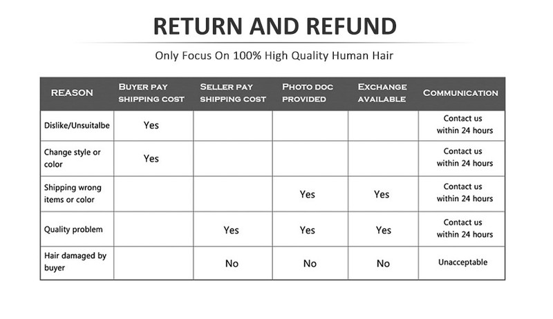 3) nous couvrirons les frais de retour pour des cheveux de mauvaise qualité, énorme différence de couleur. Pour un retour personnel, vous devrez couvrir les frais de retour.