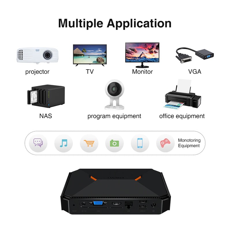 ![]() Package Contents | 1* Mini pc 1* 12V 2A DC charger/ cable 1* VESA Bracket 1* User Manual 1* Warranty Card |