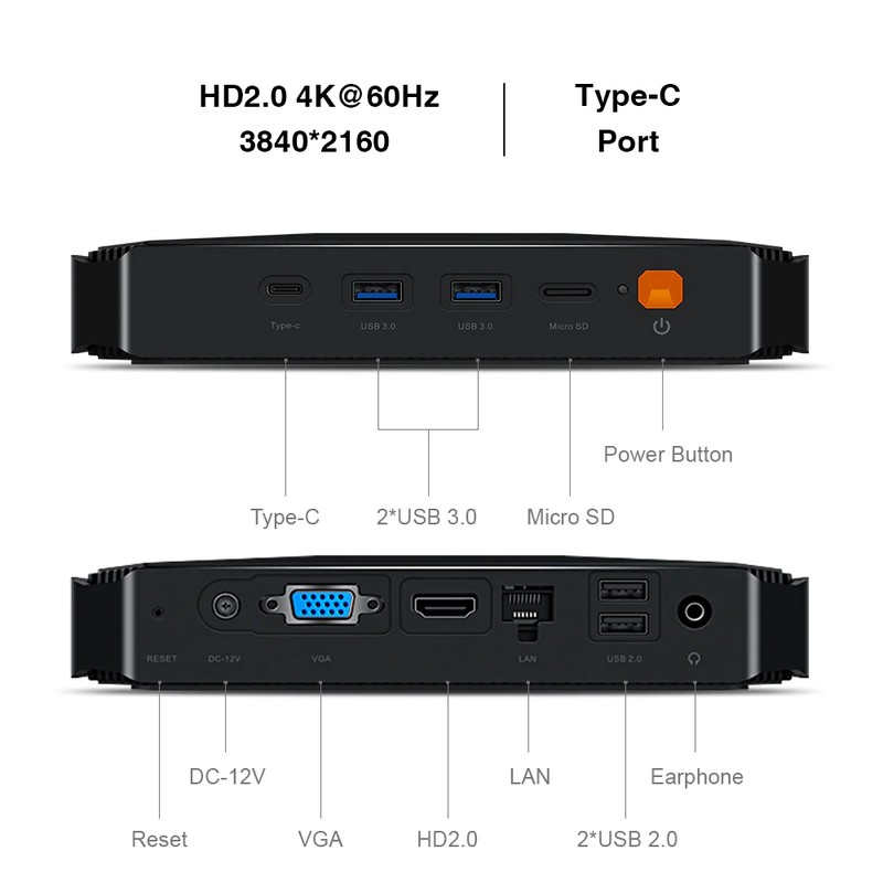 ![]() Connectivity | SATA HDD: Bulit in, MAX. 2TB MicroSD Card Interface: Yes USB Interface:2*USB-A 2.0, 2*USB-A 3.0 Type-C Interface: Support USB3.0 HD Interface: Type A*1 2.0, 4K30 VGA Port: Support 3.5mm Headphone Jack:Yes DC Interface:For power |