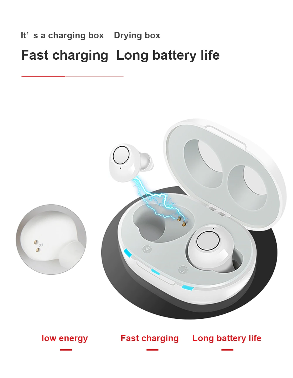 Le récipient pratique de 1.6 × 2.3 × 1.1in/4.1 × 5.8 × 2.8cm vous indique quand vos supports d'écoute sont sous tension et quand ils sont prêts à l'emploi.