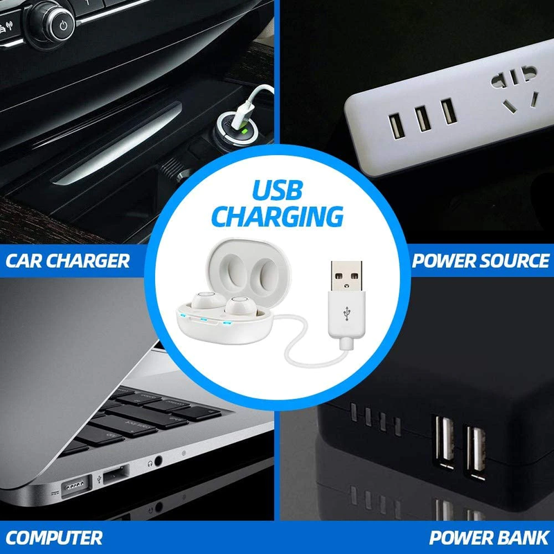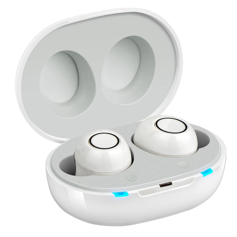 Les appareils auditifs: placez-les soigneusement dans la boîte de chargement. Une lumière bleue sera affichée pendant la charge et une lumière blanche quand ils sont complètement chargés.