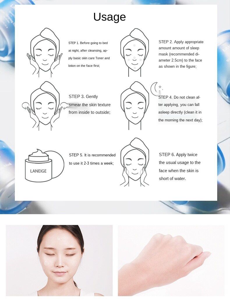 Mode d'emploi: 1. Prenez la quantité appropriée (environ 2.5cm de diamètre) de masque de sommeil, pointez au bout du nez, des joues, du front, de la mâchoire, sentez d'abord le parfum du masque. Appliquez doucement la texture de la peau de l'intérieur vers l'extérieur. Pas besoin de laver, peut dormir directement. Le lendemain peut être nettoyé.