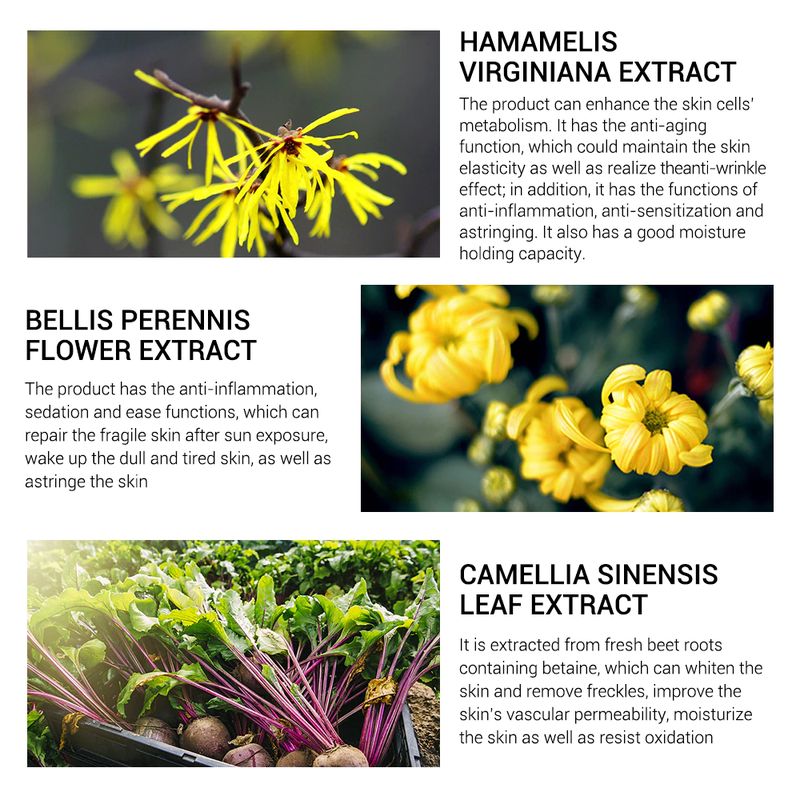 EXTRAIT D'HAMAMELIS VIRGINIANA Le produit peut améliorer le métabolisme des cellules de la peau. Il a la fonction anti-âge, qui Pourrait maintenir l'élasticité de la peau ainsi que réaliser l'effet anti-rides; En outre, il a les fonctions d'anti-inflammation, d'anti-sensibilisation et d'astringation. Il a également une bonne capacité de rétention d'humidité.