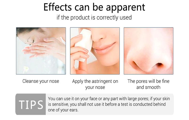Mode d'emploi: appliquez l'astringent sur votre nez. Les pores seront fins et lisses. Conseils: vous pouvez l'utiliser sur votre visage ou sur toute partie avec de grands pores; Si votre peau est sensible, vous ne devez pas l'utiliser avant qu'un test ne soit effectué derrière une de vos oreilles. Utilisation: 1. Le produit peut être utilisé après avoir retiré tout masque nasal et nettoyé la peau. 2. Obtenez une petite quantité et appliquez-la sur les points noirs. Massez doucement jusqu'à absorption du produit. Il peut être utilisé pour les visages.
