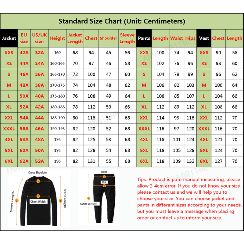 Cher client. Si vous avez besoin d'une taille personnalisée, veuillez envoyer ces mesures corporelles à notre service client: a: hauteur B: poids 1. Épaule 2. Longueur des manches 3. Commode 4. Ventre 5. Pantalon taille 6. Hanches 7. Veste longueur 8. Pantalon longueur 9. Cuisse 10. Autres demandes: telles que manchette de manche, bas de pantalon, couleur, mince ou ample, longueur de gilet et ainsi de suite. Veuillez vous assurer que ces mesures corporelles sont correctes, c'est très important.(règle proche du corps lors de la mesure)