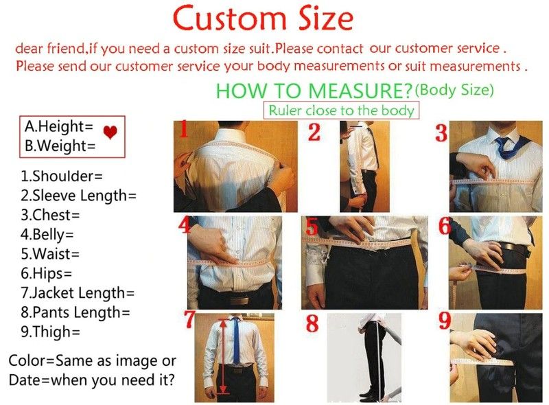 Cher client. Si vous avez besoin d'une taille personnalisée, veuillez envoyer ces mesures corporelles à notre service client: a: hauteur B: poids 1. Épaule 2. Longueur des manches 3. Commode 4. Ventre 5. Pantalon taille 6. Hanches 7. Veste longueur 8. Pantalon longueur 9. Cuisse 10. Autres demandes: telles que manchette de manche, bas de pantalon, couleur, mince ou ample, longueur de gilet et ainsi de suite. Veuillez vous assurer que ces mesures corporelles sont correctes, c'est très important.(règle proche du corps lors de la mesure)