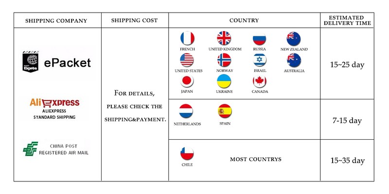 2. Normalement, nous vous expédierons gratuitement les marchandises par china post air mail, veuillez d'abord nous contacter si vous souhaitez expédier par DHL, UPS, EMS, Fedex ou d'autres sociétés d'expédition.