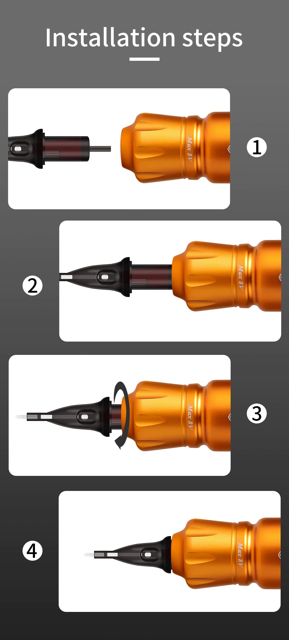2. Cette machine à tatouer est compatible avec presque toutes les marques d'alimentations électriques et de types d'aiguilles à cartouche.