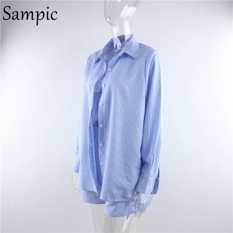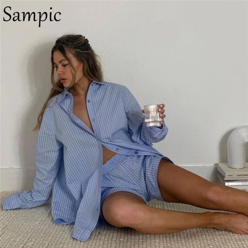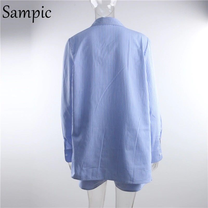 Sampic – Ensemble Deux Pièces Pour Femmes, Survêtement, Short À Rayures Manches Longues Chemise Et Mini Short Taille Haute, Le plus récent