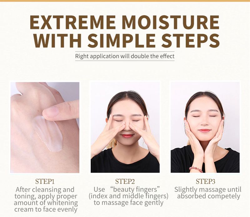 1. Après le nettoyage et la tonification, appliquez une quantité appropriée de crème blanchissante sur le visage de manière uniforme