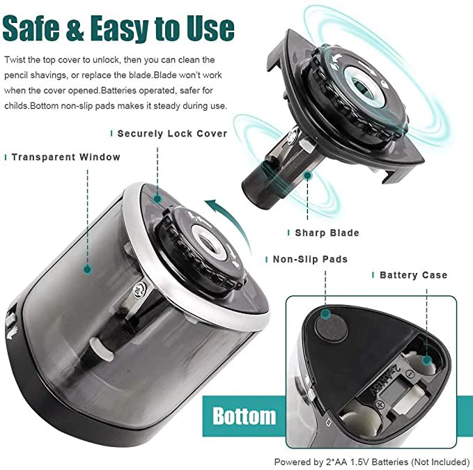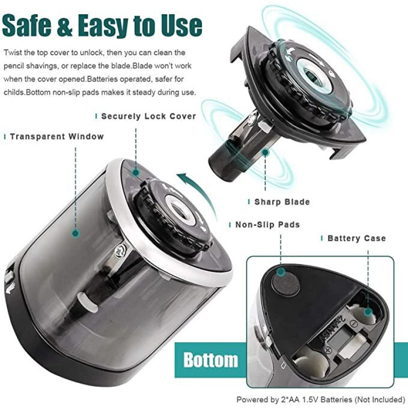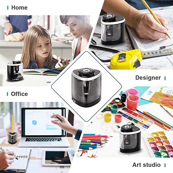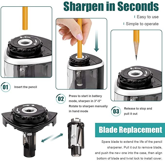 Notre affûteur électrique a deux modes à choisir. Mode automatique: appuyez sur le crayon pour commencer à travailler et affûter automatiquement, suffisamment pour aiguiser facilement chaque crayon dans la position idéale et durable en 3-5 secondes. Mode manuel: lorsque la batterie est faible, vous pouvez passer en mode manuel pour aiguiser les crayons de couleur, puis devenez un manuel d'aiguisage de crayon exceptionnel lorsque vous dessinez avec des enfants à l'extérieur.