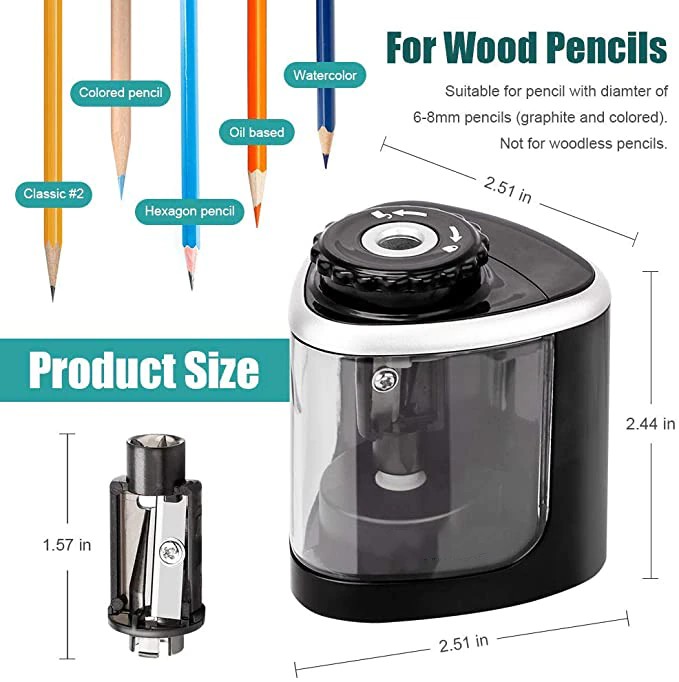 Un taille-crayon qualifié pour les crayons de couleur peut aiguiser les crayons de couleur; Convient aux crayons ronds et hexagonaux. Utilisez une boîte en bois populaire en graphite et des crayons de couleur (tels que les crayons de Dixon Ticonderoga, Colore, agrafes, officeepot, Prismacolor, Crayola, sran Art, Color Doodle, vinci, etc. pour les tests). Ne convient pas aux crayons sans bois.