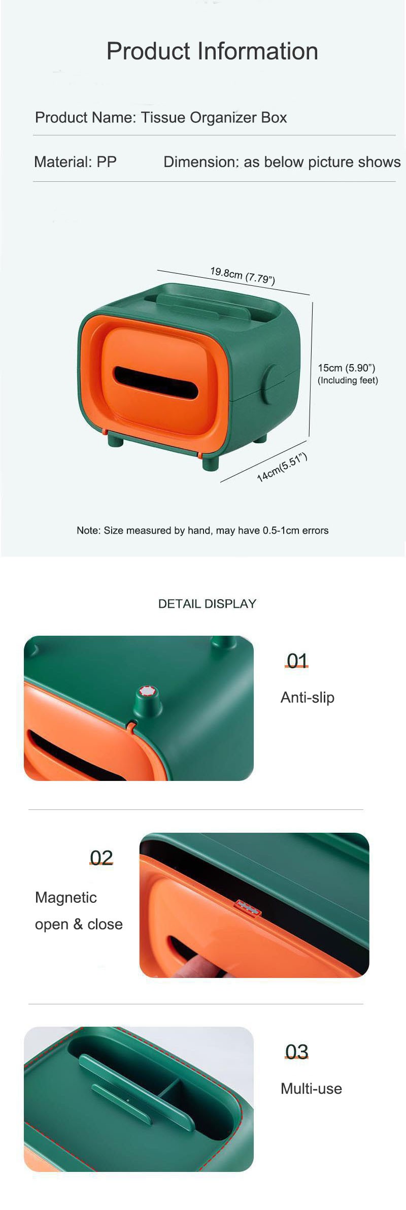 【 Haute qualité matériaux 】 Solide, épais et résistant aux chutes, fabriqué en polypropylène écologique, Abs + Pp + bois, sans odeur, sans bavures, coins lavables, polis et lisses, plus sûrs à utiliser, le support de boîte à mouchoirs utilise des patins antidérapants conçus pour le rendre stable, pas facile à tomber, Et la surface couverte est facile à nettoyer.