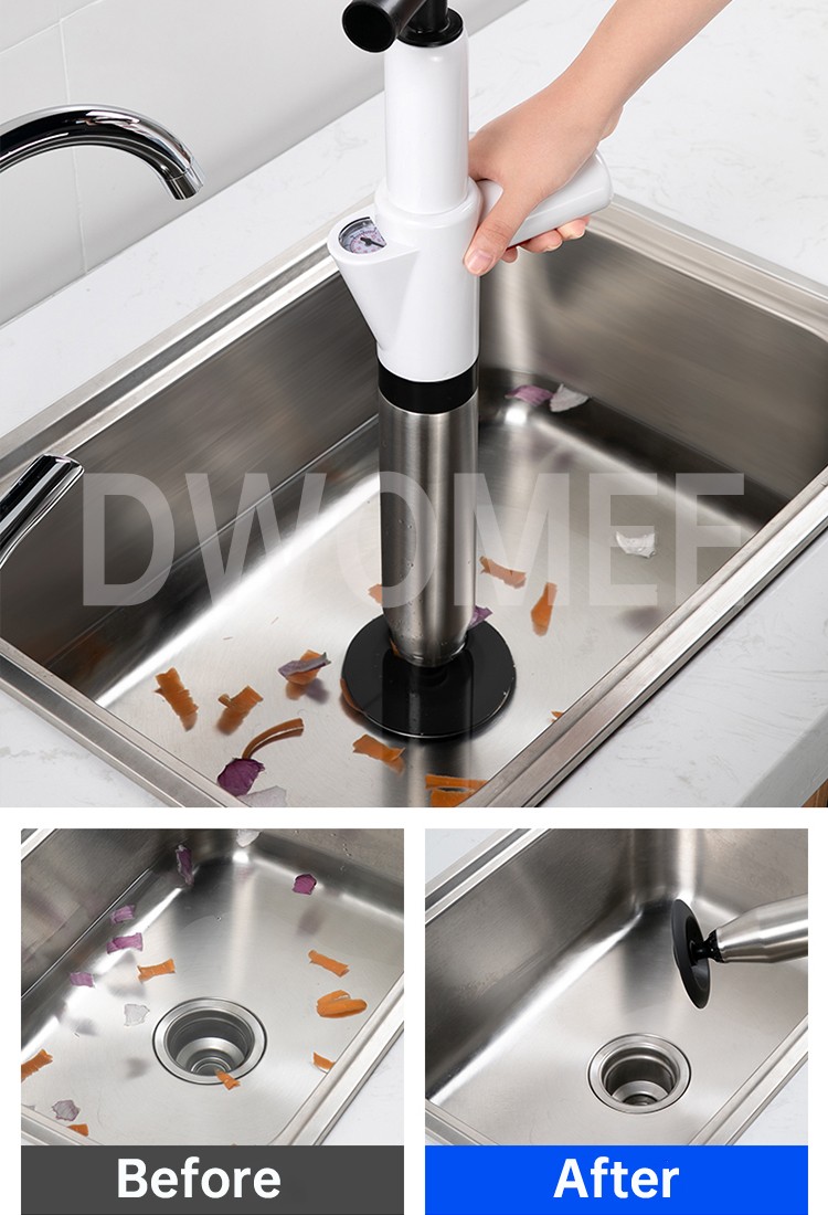 Dwomee – poussoir de toilettes-résolvez plus d'un problème à la fois! Le puissant blaster de vidange d'air manuel utilise l'inertie du moteur pour pousser la turbine, puis l'air comprimé sera poussé dans le cylindre, ainsi, la puissance de l'air comprimé peut nettoyer les bouchons les plus durs dans vos drains en seulement quelques secondes. Avec 4 têtes de piston interchangeables qui sont tête de toilettes, tête de lavabo, tête de tuyau d'égout et tête d'évier, le piston propre est un produit innovant qui peut rapidement éliminer les boues, Cheveux, papier toilette, restes de nourriture, tuyaux de vidange intérieurs de lavabo, toilettes, baignoires, douche, évier, poêle accroupie, drain de sol, tuyaux bouchés, etc. Sans besoin d'électricité, vous pouvez l'utiliser partout et partout.
