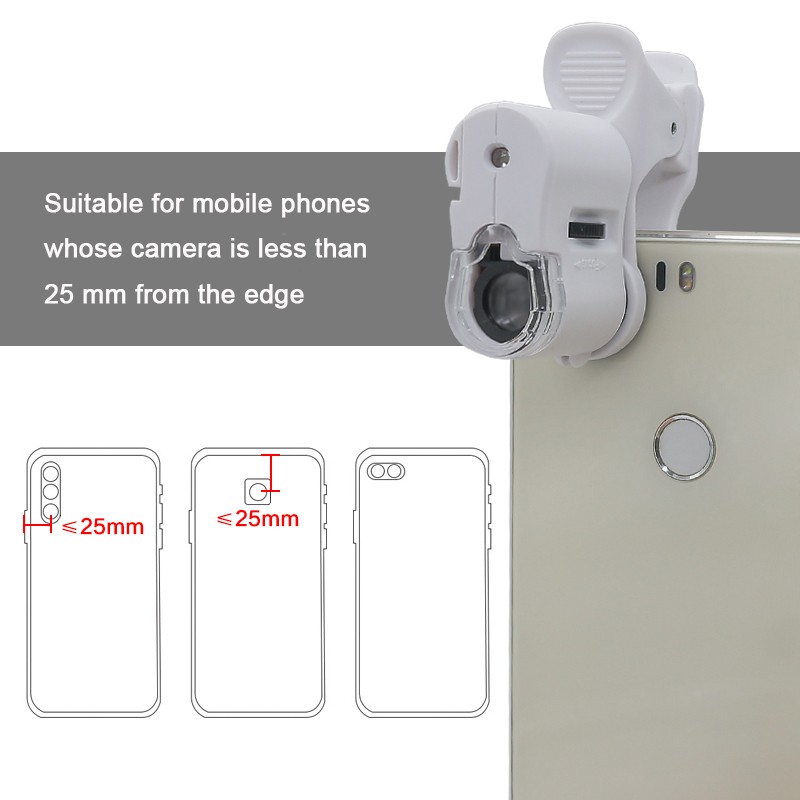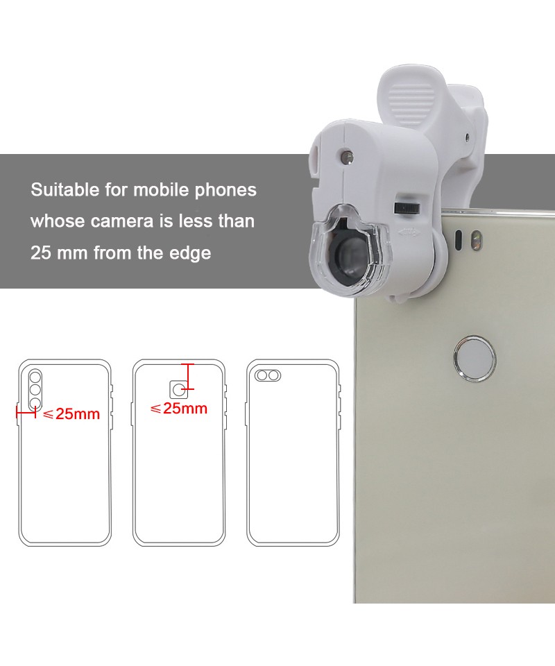 Spécification Type d'article: Microscope de Type Clip de téléphone intelligent Matériau: ABS, lentille optique Grossissement: 60X Couleur: Blanc Éclairage: lumière LED, lumière UV LED: 2 perles de LED Quantité: 1 pièce Taille du produit: 60x56x22mm (clip inclus) Poids Net: 24 g Batterie: 3 piles boutons (incluses) Convient pour: gemme, bijoux, tissus, circuits, calligraphie et peinture, pièces de monnaie, etc. Attention Le smartphone n'est pas inclus.