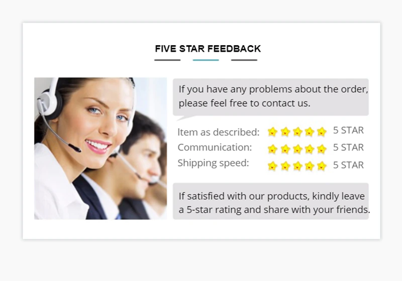 1. Comme vos commentaires sont très importants pour le développement de notre entreprise, si vous êtes satisfait de nos produits et services, nous vous invitons sincèrement à nous laisser des commentaires positifs. Il vous prend seulement 1 minute.