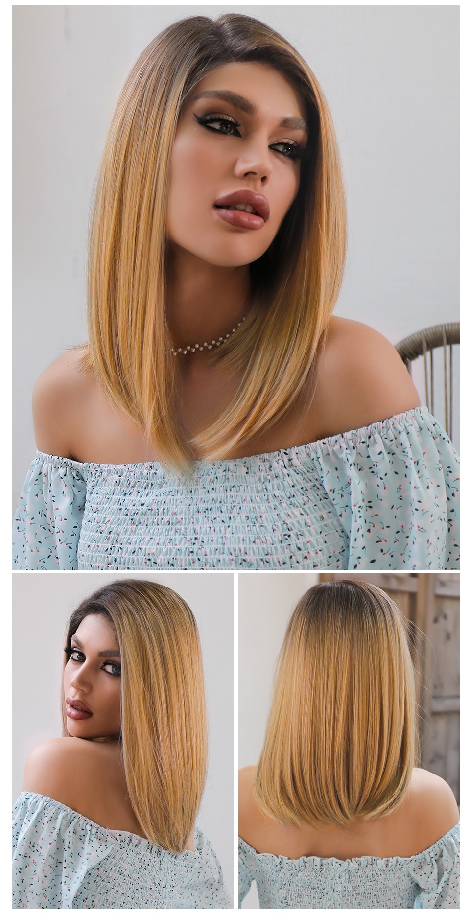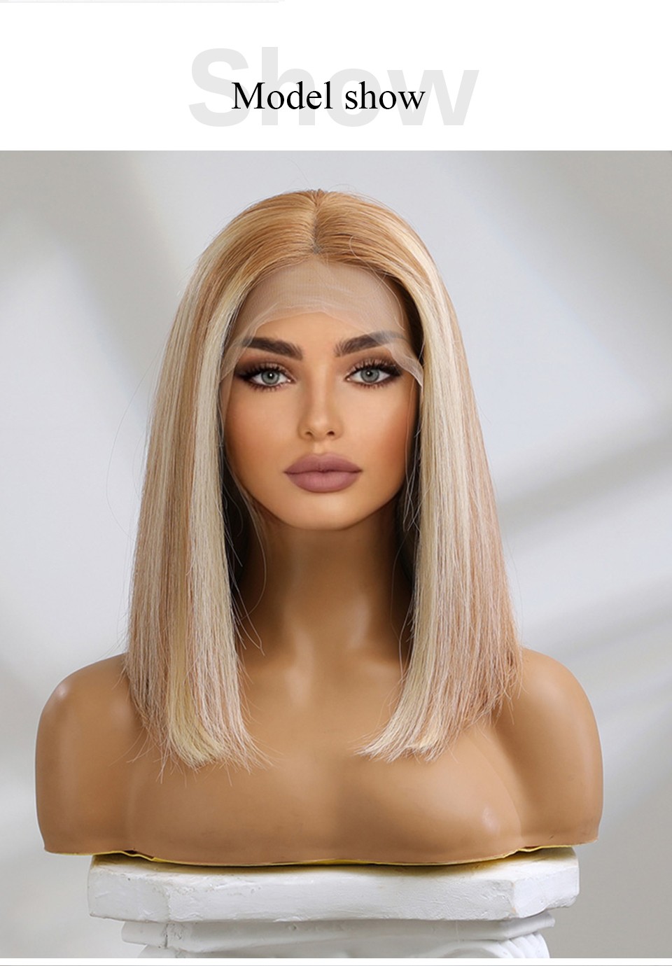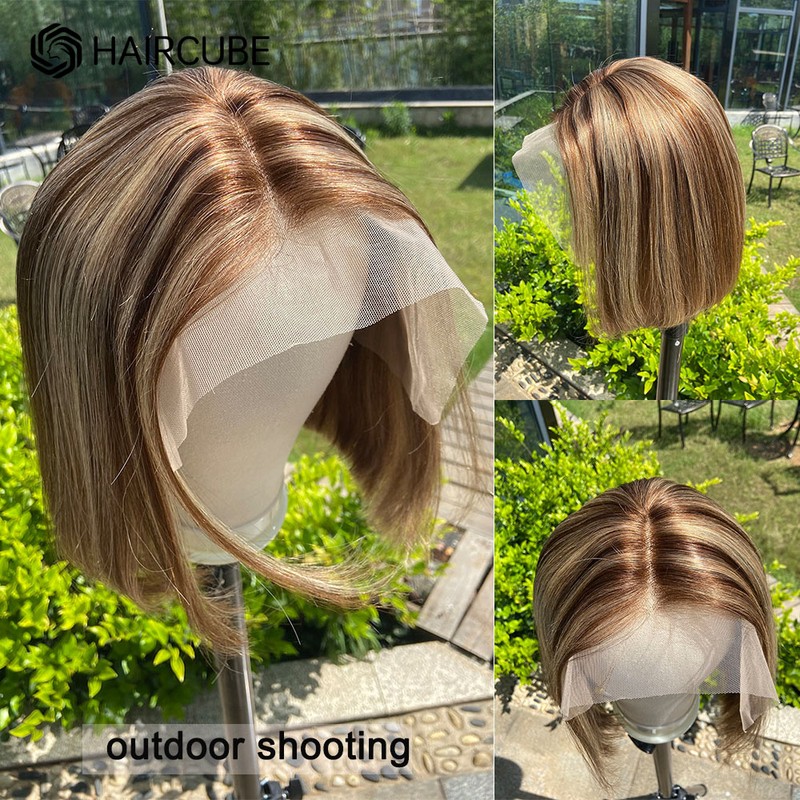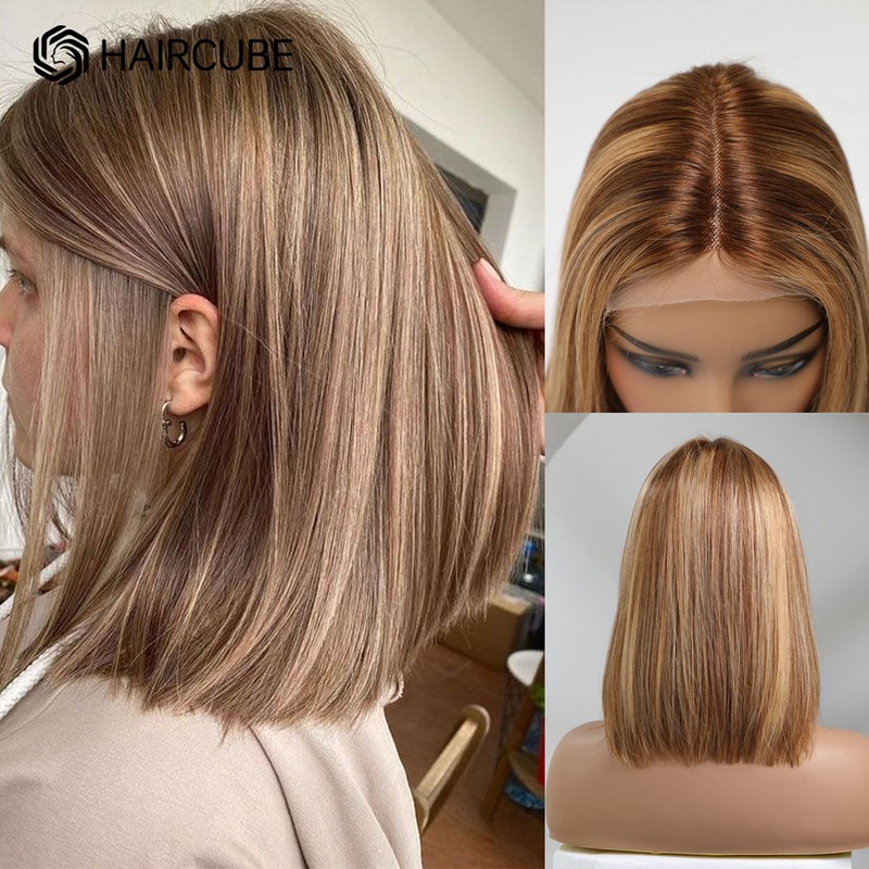 HAIRCUBE Brown Short Straight Wigs for Women 13*1 Lace Front Human Hair Wig Women's Middle Parted Ombre Blonde Bob Remy Hair Wig