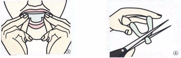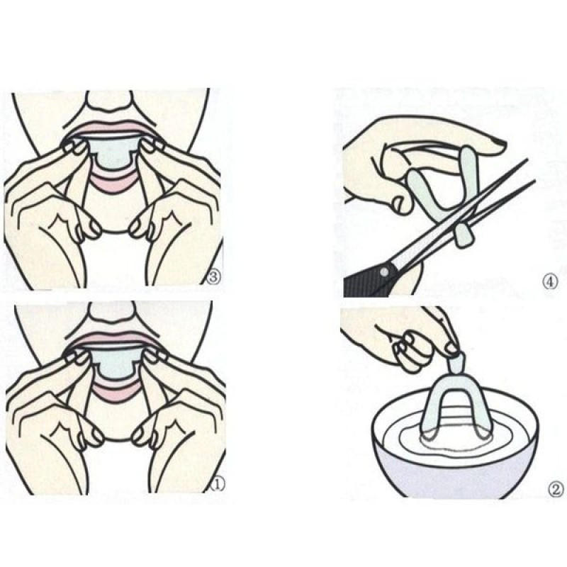 Il trim vassoio: Rimuovere il vassoio dito premuto dopo 10-15 secondi, sciacquare con acqua. Impronta lungo il vassoio di la linea di gomma (che linea tra i denti e le gengive) con le forbici per tagliare il materiale in eccesso, e, infine, tagliato fuori la maniglia. (Taglio sopra la linea di gomma sezione, si può solo di prendere contatto con il dente gel, evitare di stimolare le gengive)