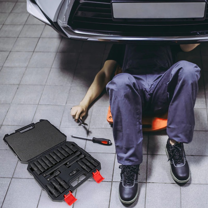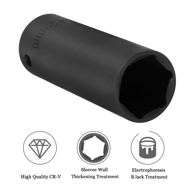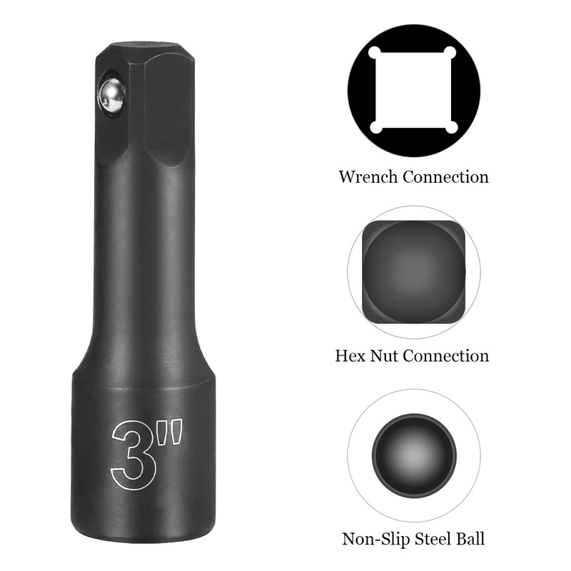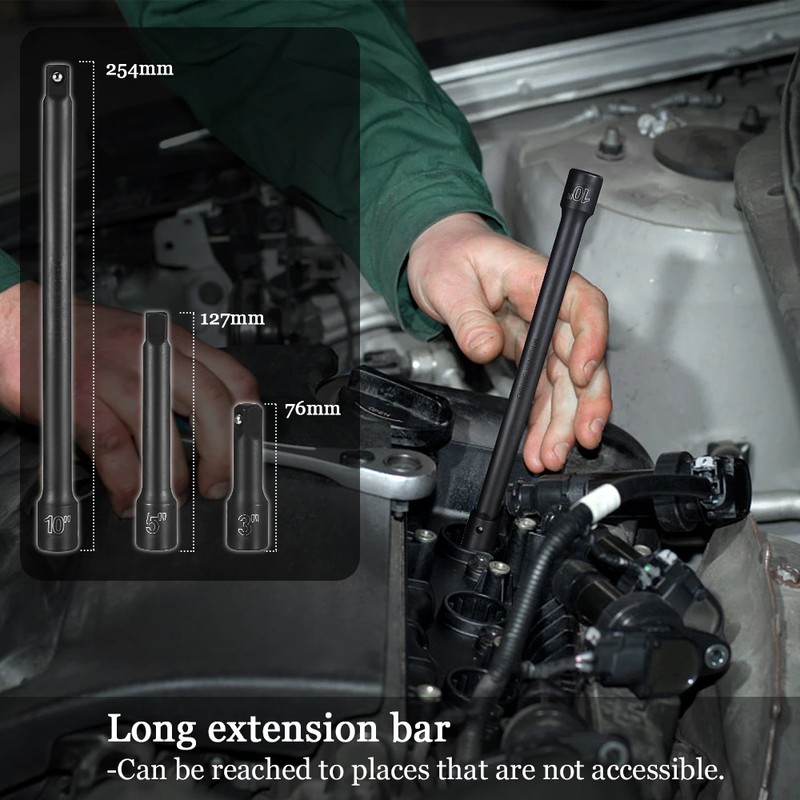 KIT completo da 20 pezzi: incluse prese da 9-24mm per soddisfare le esigenze dei lavori di manutenzione quotidiana. Dotato di barre di prolunga da 3 '', 5'', 10 ''per l'accesso a fori filettati profondi. L'adattatore consente di utilizzare il manicotto con una chiave elettrica 3/8.
