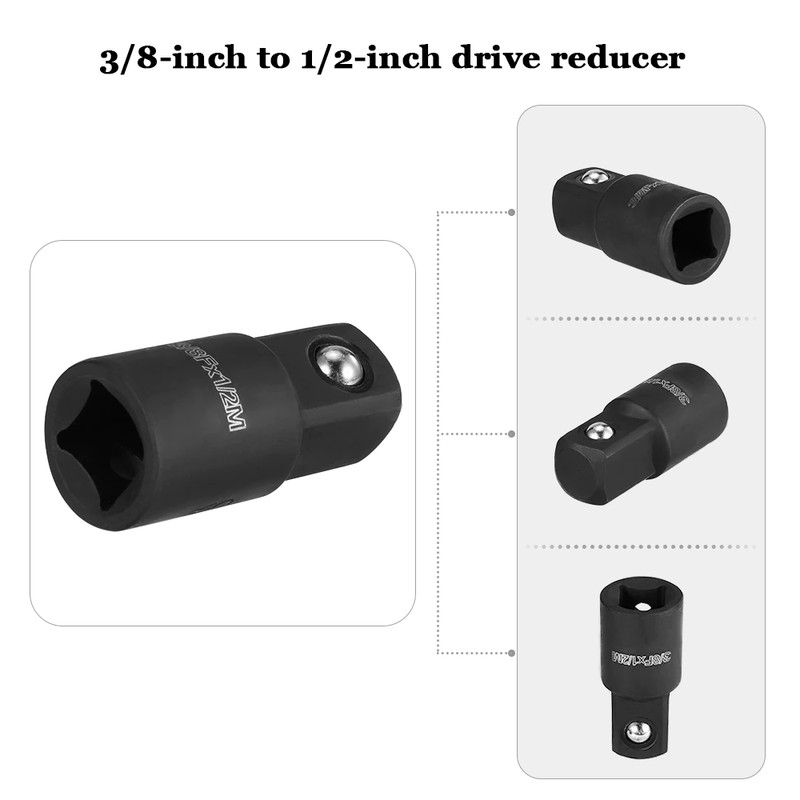 Adattatore per chiave a bussola da 3/8 'a 1/2 '': progettato per l'uso con chiave a percussione da 3/8''. La sua sfera detent caricata a molla aiuta in modo sicuro ad agganciare le prese, impedisce loro di cadere.