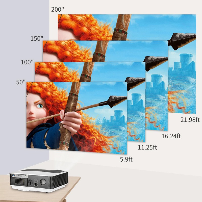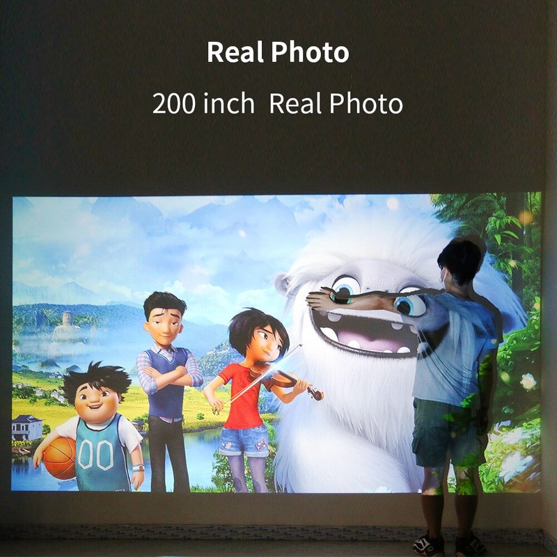 Il proiettore è in grado di progetto per una distanza da 1.3-7.5m, È possibile regolare la posizione del proiettore in base alle vostre abitudini. Il proiettore in grado di proiettare su un 200 pollici schermo di grandi dimensioni.