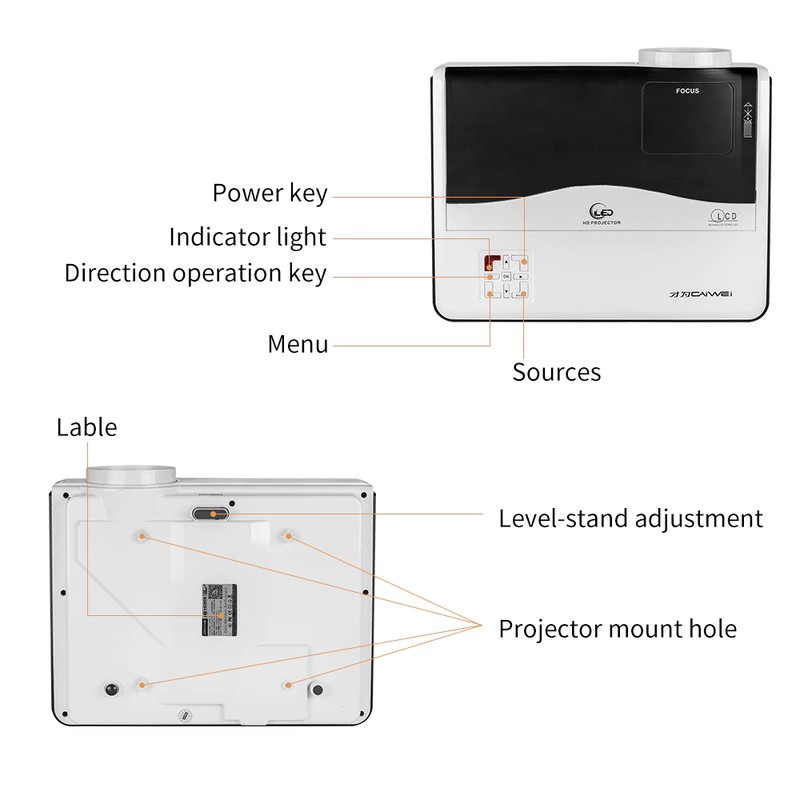 Il proiettore è dotato di molti tasti sul proiettore, tasto di accensione per aprire il proiettore. Direzione il tasto di funzionamento per fare in modo che la direzione. Ci sono molte interfacce sul proiettore. Sul fondo del proiettore, ci sono quattro viti.