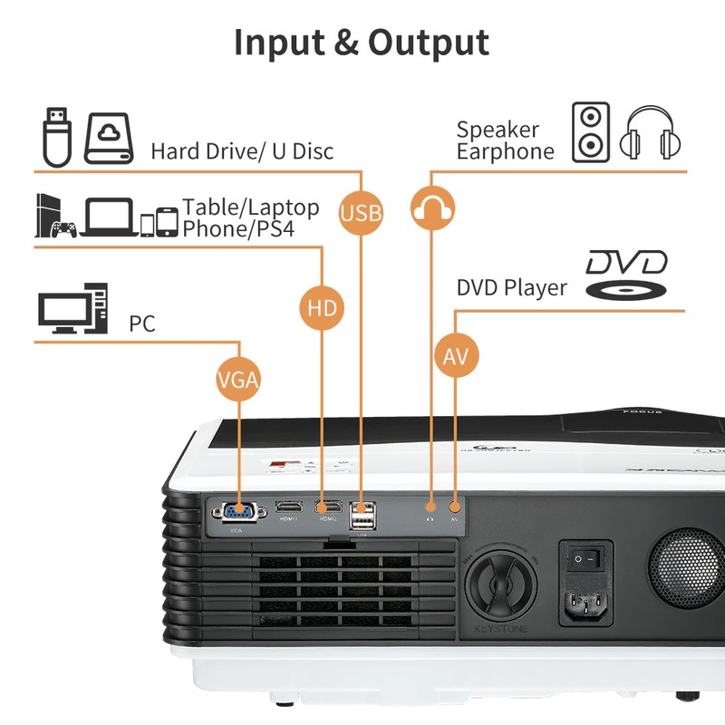 Il proiettore è dotato di molte interfacce, è in grado di connettersi con hard disk, disco u, tablet, computer portatile, iphone,ps4,pc, altoparlante, auricolare, lettore dvd.
