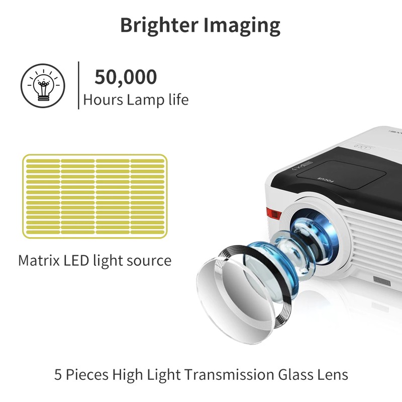 La lampada del proiettore è dotato di 50000 ore di vita, rende l'immagine più luminoso e chiaro. Il proiettore applicare ha condotto la lampada, la lente è 5 pezzi di alta transimission obiettivo di vetro.