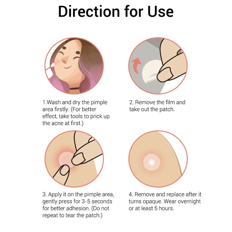 3. Applicare sulla zona brufolo, premere delicatamente per 3-5 secondi per una migliore adesione. (Non ripetere a strappare la patch.)