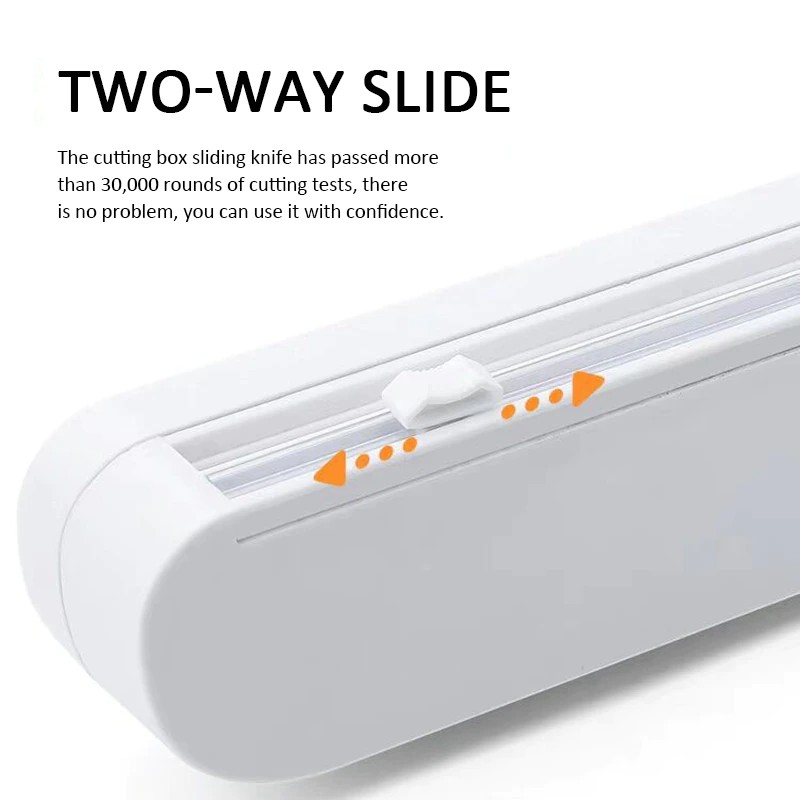 Di ALTA QUALITÀ: realizzato in materiale ABS, ad alta temperatura e resistenza alle basse temperature, resistente, sano, la tutela dell'ambiente, non tossico e nessun odore. Bidirezionale taglierina scivolo di pulsante, tirare fuori la quantità di pellicola che si desidera, si può tagliare da sinistra a destra o da destra a sinistra senza intoppi, senza l'utilizzo di pericolosi seghetto lama o forbici. Il piccolo cutter tagli perfettamente, non piegato o bloccato a se stesso di plastica sopra piatto. E 'in grado di durare a lungo a vita per uso domestico.
