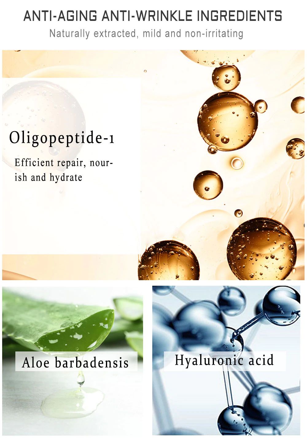 Ingrediente: Oligopeptide-1, Aloe Barbadensis, acido ialuronico, ecc