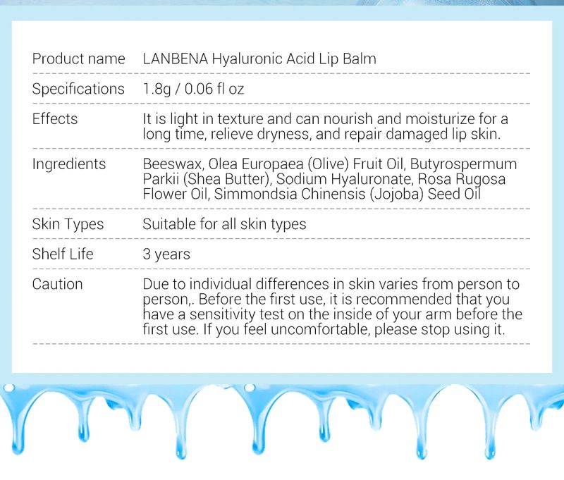 Nome del prodotto: LANBENA Acido Ialuronico Balsamo per le labbra Specifiche 1 .8g/ 0.06 once fluide Effetti: Si Tratta di luce nella struttura e può nutrire e idratare per un lungo periodo di tempo, alleviare la secchezza, E riparazione danneggiato pelle delle labbra. Ingredienti: Cera D'api, Olea Europaea (Olive) di Olio di Frutta, Butyrospermum Parkii (Burro di Karitè), ialuronato di sodio, Olio Del Fiore di Rosa Rugosa, Simmondsia Chinensis (Jojoba) olio di Semi I Tipi di pelle: adatto a tutti i tipi di pelle Shelf Life:3 anni Attenzione: a causa di differenze individuali in pelle varia da persona a persona,. Prima del primo utilizzo, si consiglia di che si dispone di un test di sensibilità sulla parte interna del braccio prima del primo utilizzo. Se si sente a disagio, si prega di smettere di usarlo.
