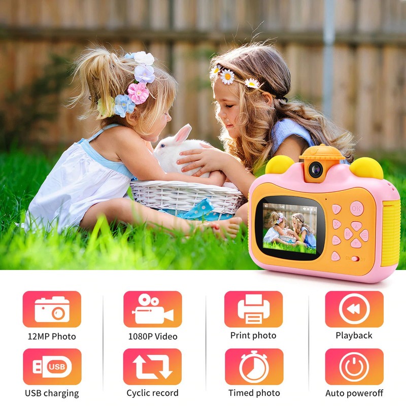 Il bambino della macchina fotografica ha funzioni di scattare foto, la registrazione video 1080p, e la stampa di foto immediatamente. 3 in 1 progettato fotocamera è più conveniente per i bambini per registrare i loro momenti meravigliosi.